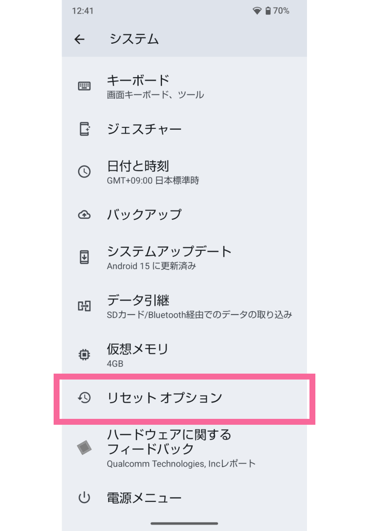 「リセットオプション」から「すべてのデータを消去(初期設定にリセット)」をタップ
