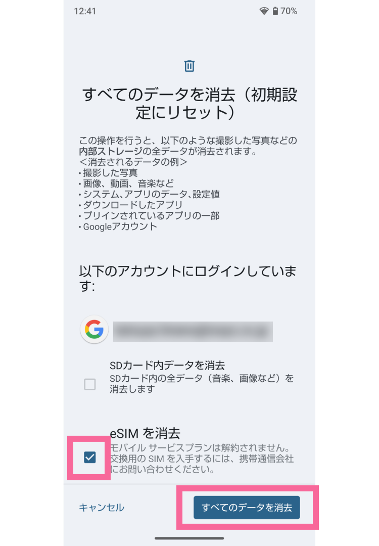 「eSIMを消去」にチェックして、「すべてのデータを消去」をタップ