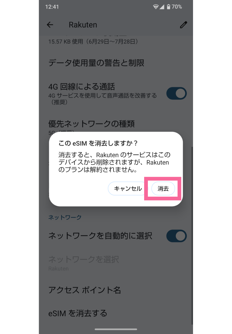 本体パスワードを入力すると、「このeSIMを消去しますか?」とポップアップがでるので、「消去」をタップ