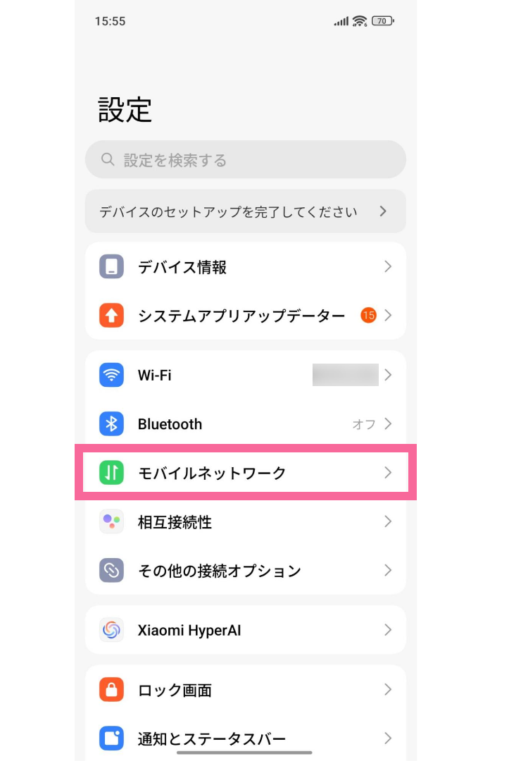 「設定」から「モバイルネットワーク」をタップ