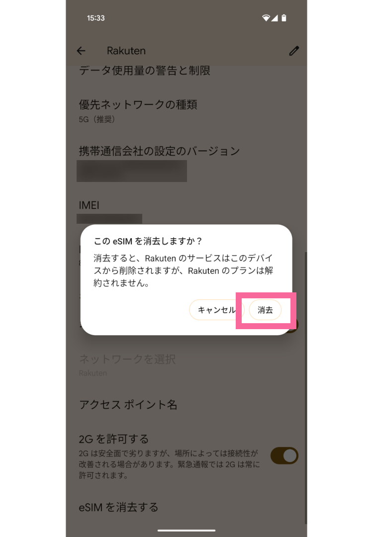 つづいて、「eSIMデータの消去」のポップアップが表示されるので「消去する」をタップ