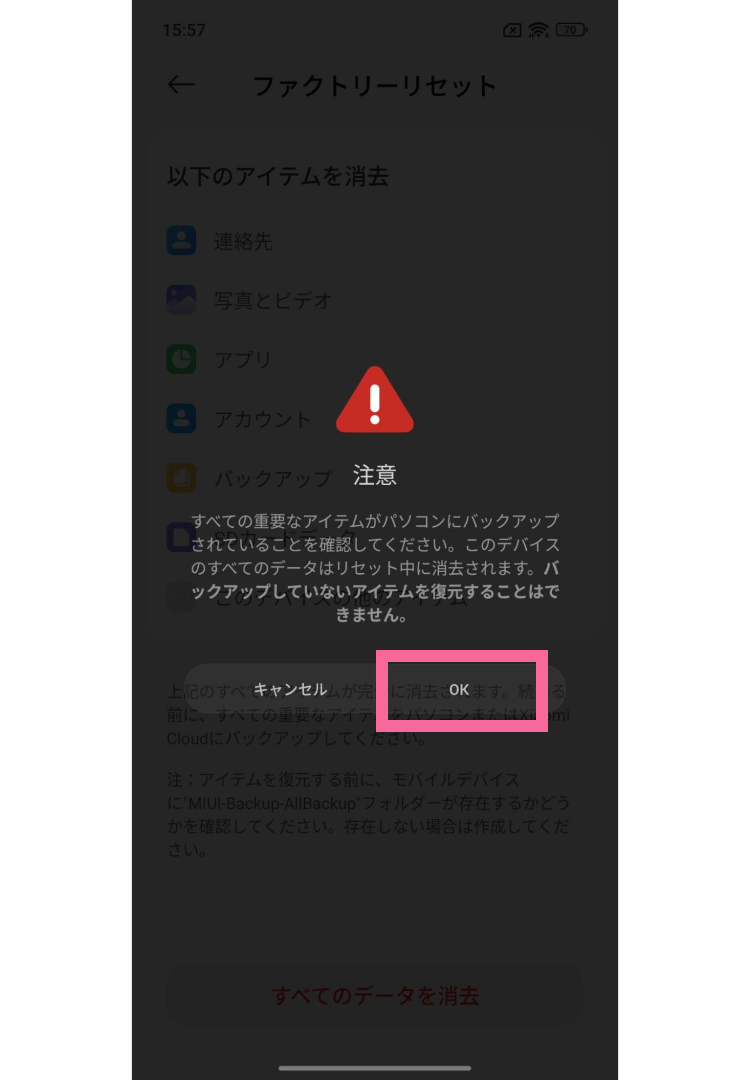 このページで紹介する「Xiaomiスマホの初期化方法」でスマホのリセットを行えば、