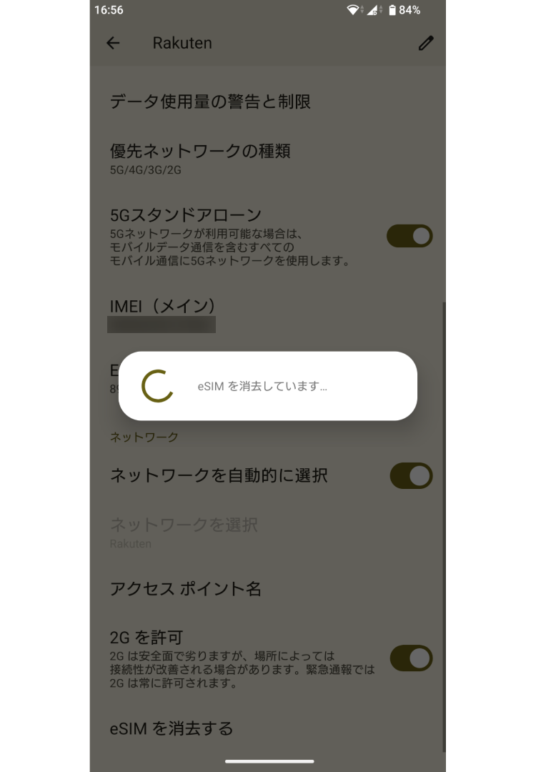 「eSIMを消去しています」と表示されるので、消去完了まで待つ