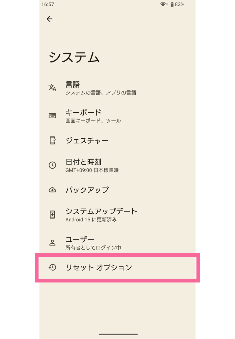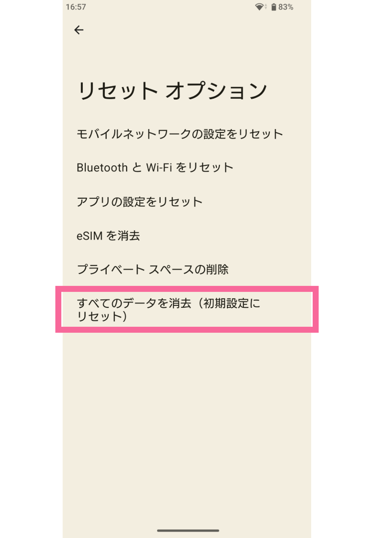 「リセットオプション」から「すべてのデータを消去(初期設定にリセット)」をタップ