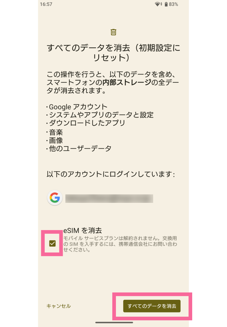 「eSIMを消去」にチェックして、「すべてのデータを消去」をタップ